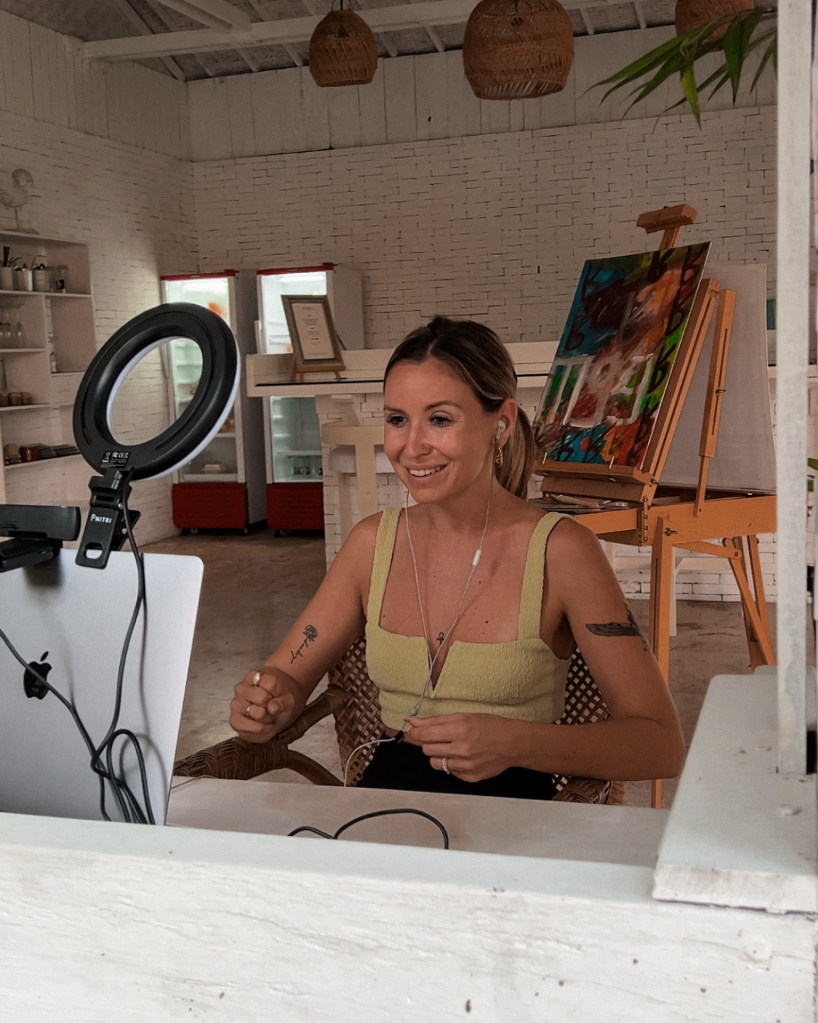 Viola Maria bei einer Live-Aufnahme ihrer Mentoring-Session, das Handy für den Livestream aufgestellt.