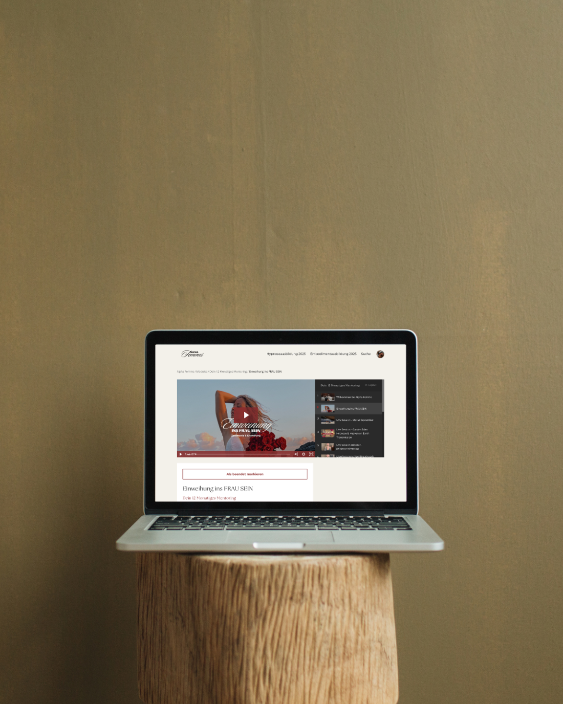 Laptop-Bildschirm zeigt den Mitgliederbereich des AlphaFam-Mentorings mit Videoübersicht.
